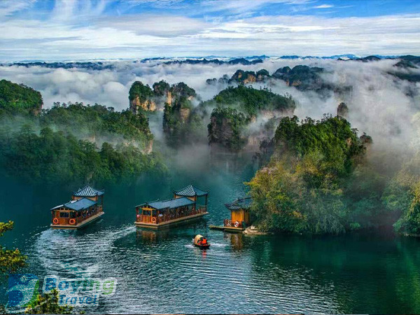13:30 Take the scenic area environmental protection vehicle to Tianzishan, visit attractions such as Helong Park, Xihai Stone Forest, Yubi Peak, and Fairy Presenting Flowers, and overlook thousands of peak forests looming in the sea of clouds
