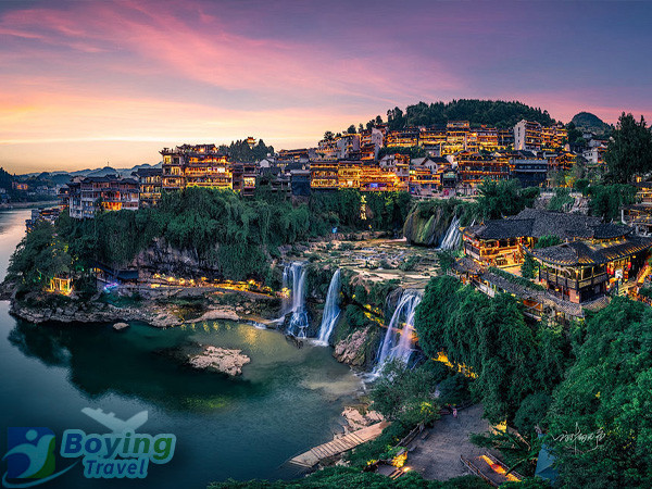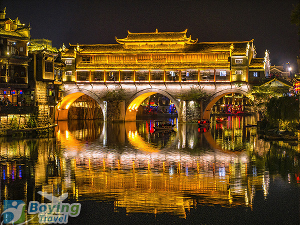 19:00 Arrive at Fenghuang Ancient Town, check in at the riverside stilted building inn, take a night tour of the Tuojiang River in the evening, admire the beautiful scenery of the ancient town's lights reflecting on the river surface, and stroll around Hongqiao and Shen Congwen's former residence