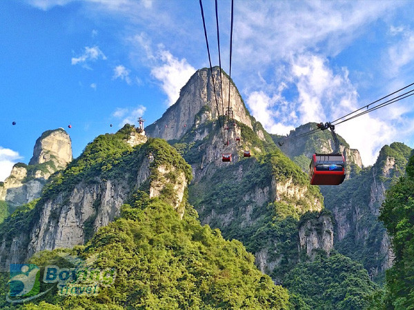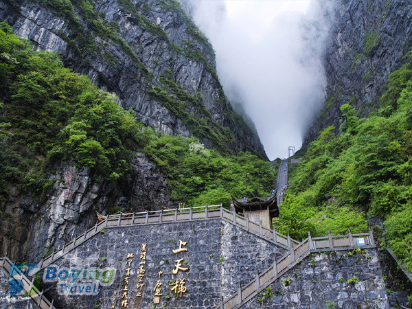 13:00 Visit the East Line Yuhu Peak and Tianmen Mountain Temple, take the through-mountain escalator down to Tianmen Cave, and check in at the 999-step ladder